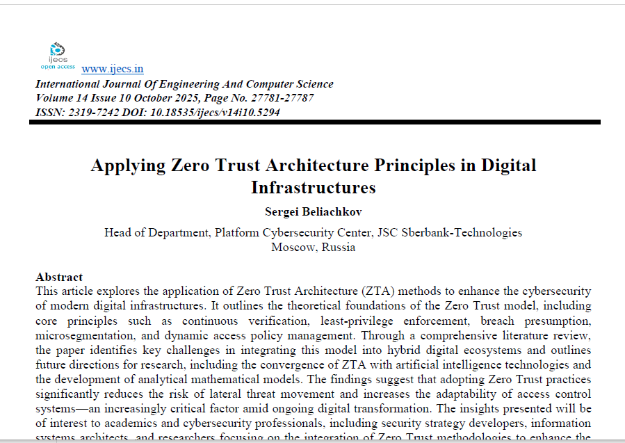 This article explores the application of Zero Trust Architecture (ZTA) methods to enhance the cybersecurity of modern digital infrastructures. It outlines the theoretical foundations of the Zero Trust model, including core principles such as continuous verification, least-privilege enforcement, breach presumption, microsegmentation, and dynamic access policy management. Through a comprehensive literature review, the paper identifies key challenges in integrating this model into hybrid digital ecosystems and outlines future directions for research, including the convergence of ZTA with artificial intelligence technologies and the development of analytical mathematical models. The findings suggest that adopting Zero Trust practices significantly reduces the risk of lateral threat movement and increases the adaptability of access control systems—an increasingly critical factor amid ongoing digital transformation. The insights presented will be of interest to academics and cybersecurity professionals, including security strategy developers, information systems architects, and researchers focusing on the integration of Zero Trust methodologies to enhance the resilience of digital environments. Additionally, the discussion offers practical value for project leaders and policymakers engaged in digital transformation initiatives and the optimization of security processes in the face of rapidly evolving cyber threats.