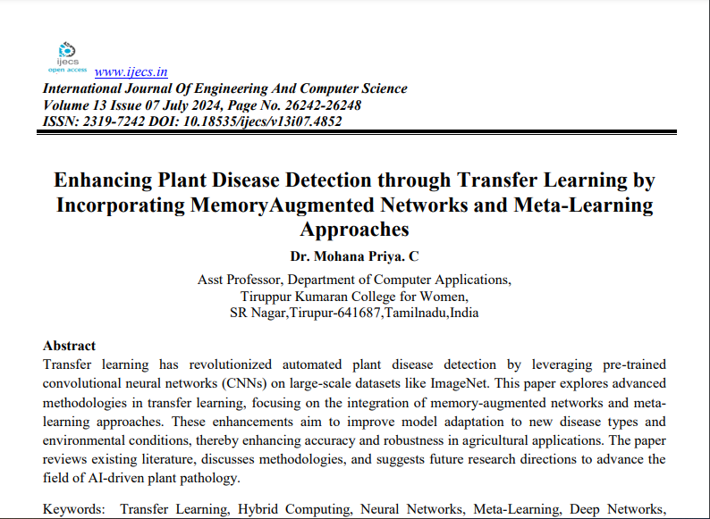 Enhancing Plant Disease Detection through Transfer Learning by Incorporating MemoryAugmented Networks and Meta-Learning Approaches