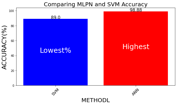 Figure 4.5 depicts the overall success rate of MLPN, and existing SVM technique. The MLPN algorithm was the best but was improved by incorporating the regularization techniques. The SVM had the lowest prediction accuracy (89.0), followed and MLPNN (98.88). The MLPNN perform exceptionally well, with performance metrics with testing set.