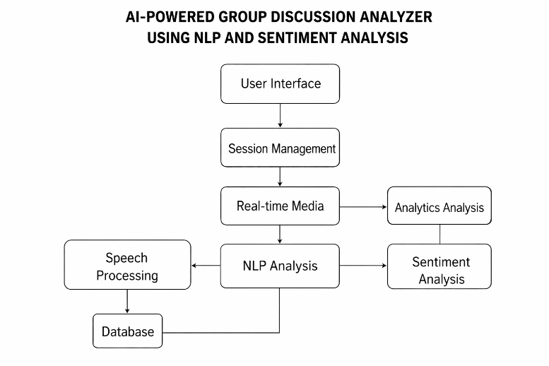 The proposed AI-Powered Group Discussion Analyzer is a web-based platform designed to facilitate real-time group discussion practice and automated performance evaluation. The system enables participants to engage in live discussions with either human users or AI-driven virtual participants. During each session, the platform captures audio input, transcribes speech in real time, analyzes linguistic and emotional characteristics, and monitors participation behavior.