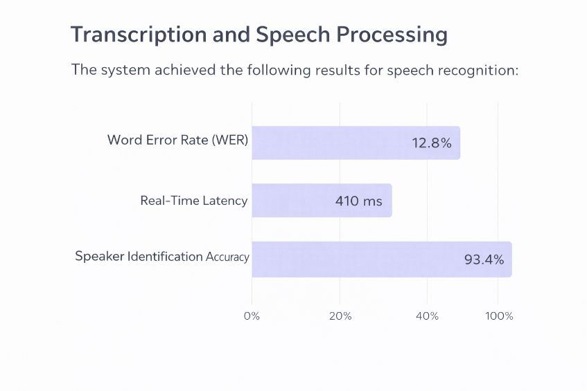 To evaluate the effectiveness and reliability of the proposed system, multiple performance metrics were considered. Speech recognition performance was assessed using transcription accuracy and Word Error Rate (WER), which measure the correctness of generated transcripts with respect to spoken input. These metrics indicate the system’s ability to accurately convert real-time audio into textual form.