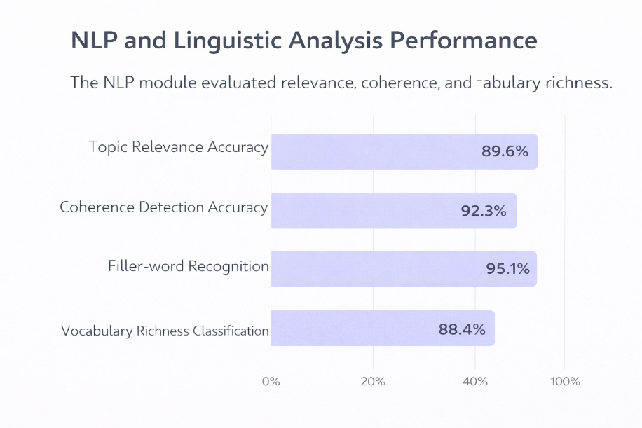 The Natural Language Processing module evaluated semantic and linguistic attributes of participant speech. The system achieved an average topic relevance accuracy of 89.6% and a coherence detection accuracy of 92.3%, demonstrating strong semantic understanding of discussion content. Filler-word recognition accuracy was observed at 95.1%, while vocabulary richness classification achieved an accuracy of 88.4%.