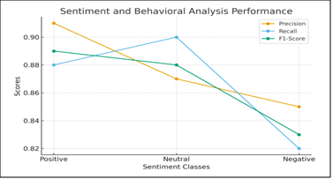 Sentiment analysis performance was evaluated using standard classification metrics, including precision, recall, and F1-score. These metrics were used to assess the accuracy and consistency of sentiment classification across different emotional categories. Topic relevance and linguistic coherence scores generated by the NLP module were also analyzed to evaluate semantic understanding.