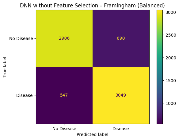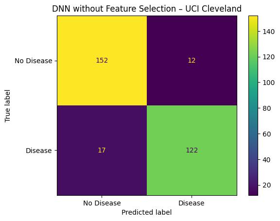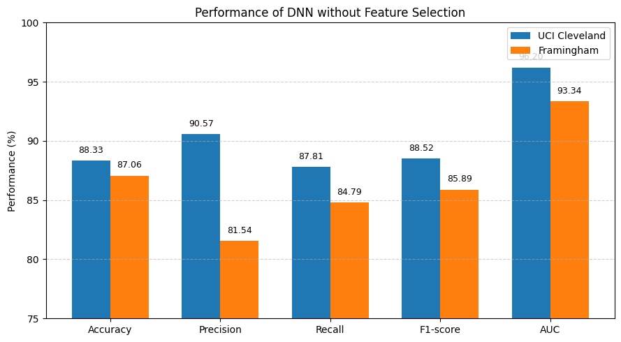 | DNN without Feature Selection | UCI Cleveland Heart Disease | 88.33% | 90.57% | 87.81% | 88.52% | 0.9620 |
