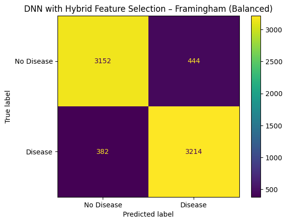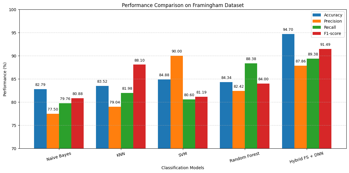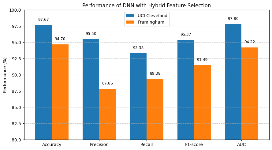 On the Cleveland dataset, the DNN achieved an accuracy of 88.33%, precision of 90.57%, recall of 87.81%, F1-score of 88.52%, and an AUC of 0.9620, outperforming Naïve Bayes, KNN, SVM, and Random Forest classifiers. Similarly, on the Framingham dataset, the DNN attained an accuracy of 87.06%, precision of 81.54%, recall of 84.79%, F1-score of 85.89%, and AUC of 0.9334. The inclusion of hybrid feature selection resulted in substantial performance improvements on both datasets. On the UCI Cleveland dataset, the proposed Hybrid Feature Selection with DNN model achieved a significantly higher accuracy of 97.67%, precision of 95.50%, recall of 93.33%, F1-score of 95.37%, and AUC of 0.9780, clearly surpassing all baseline classifiers and the DNN without feature selection. Likewise, on the Framingham dataset, the optimized model recorded an accuracy of 94.70%, precision of 87.86%, recall of 89.38%, F1-score of 91.49%, and AUC of 0.9422. These results show that our proposed hybrid feature selection with DNN model demonstrates state-of-the-art capability for heart disease prediction than traditional machine learning models.