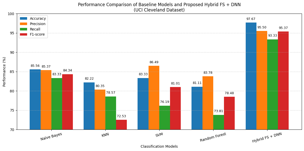 In this work, we applied commonly used machine learning classifiers, including SVM, Random Forest, KNN, and Naïve Bayes, as baseline models to evaluate the effectiveness of our proposed framework. All models were trained using the same dataset configuration, identical preprocessing steps, and consistent evaluation metrics to ensure a fair and unbiased comparison. The evaluation was conducted in two stages: first, by training the models without feature selection, and second, by incorporating the proposed hybrid feature selection approach. This structured comparison clearly demonstrates the performance improvements achieved after feature selection and highlights the effectiveness of the Hybrid Feature Selection combined with the DNN model. The comparative results, summarized in Table 5, confirm that the proposed approach outperforms conventional machine learning methods for heart stroke prediction.