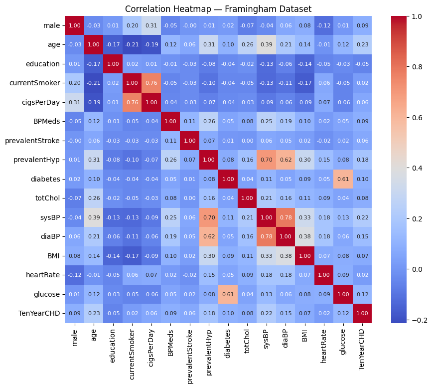 We analyzed the correlation patterns in both the Cleveland and Framingham datasets to understand the individual influence of clinical attributes on heart disease outcomes. As illustrated in Figure 3, the Cleveland dataset exhibits strong to moderate associations between the target variable and features such as thal, ca, exang, oldpeak, and chest pain type, indicating their significant role in disease prediction. In contrast, the Framingham dataset shows relatively weaker correlations overall, as presented in Figure 4, where age, systolic and diastolic blood pressure, and prevalent hypertension emerge as the most influential predictors. Other metabolic and lifestyle factors, including cholesterol, BMI, smoking-related variables, and heart rate, demonstrate limited standalone impact. These observations highlight the distinct feature–outcome relationships across the two datasets and justify the need for dataset-specific modeling and feature selection strategies.