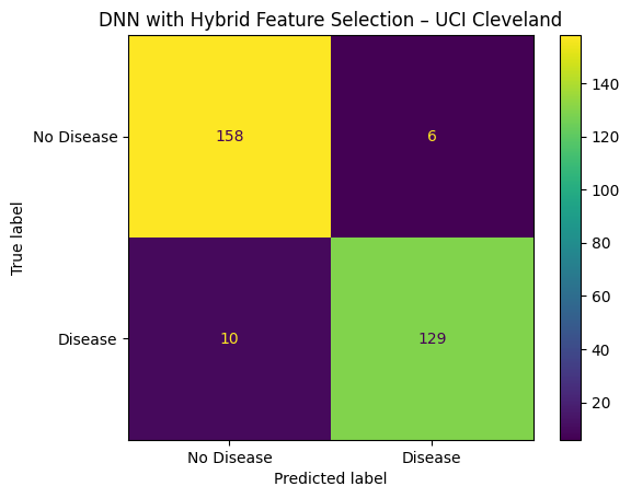 | DNN with Hybrid Feature Selection | UCI Cleveland Heart Disease | 97. 67% | 95.50% | 93.33% | 95.37% | 0.9780 |
