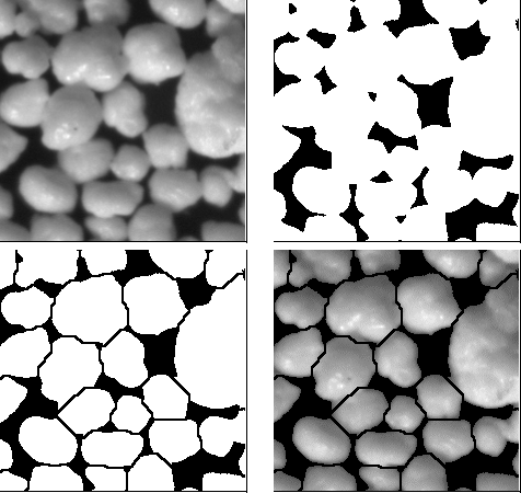 This problem is solved by performing a watershed separation on the image. A normal greyscale image has 8 bit colour depth = 256 greyscales The image at the lower right of figure 10 shows the result of performing a logical AND of the two images at the left of Figure. This shows the effect that the watershed separation has on touching objects in the original image.