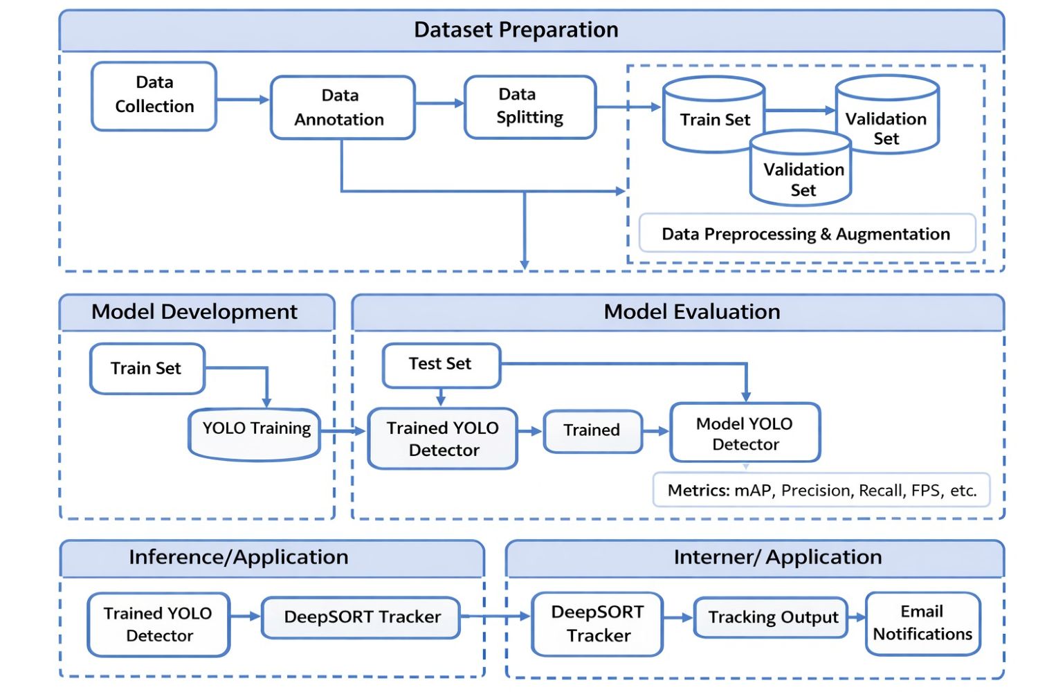 Incorporating DeepSORT into the system complemented the object detection process by establishing and maintaining a consistent identity for detected objects across sequential frames. The results obtained from training YOLOv11 on the custom dataset were integrated into DeepSORT for real-time vehicle tracking. DeepSORT tracked detected vehicles across frames, assigning unique IDs to monitor their movements. The detected and tracked vehicles were compared against predefined parking zones to flag unauthorized parking. This is vital for understanding trajectories and interactions in complex traffic scenarios, and it reduces identity switches and maintains consistent object identities significantly.