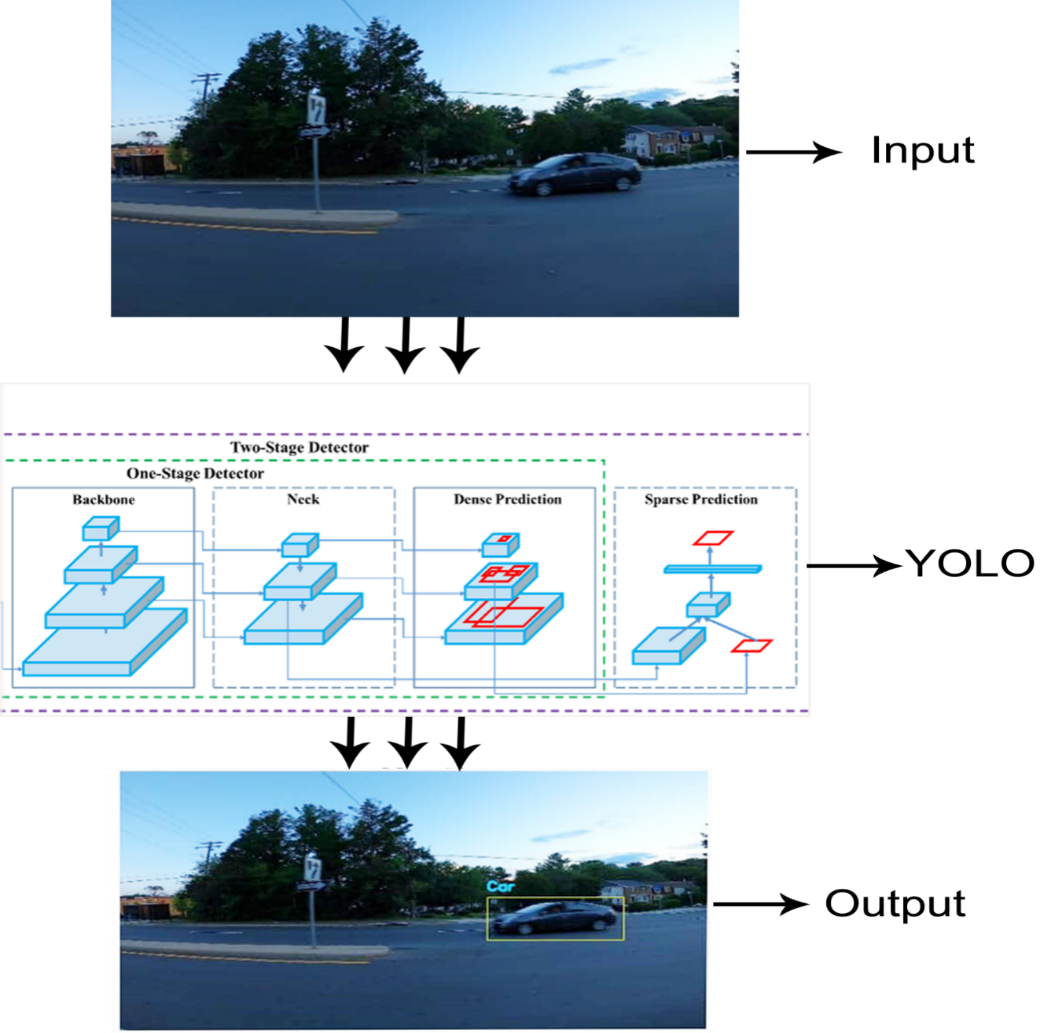 The YOLO system consisted of components that include input layer, backbone, neck, dense prediction, and sparse prediction to enhance object detection capability.